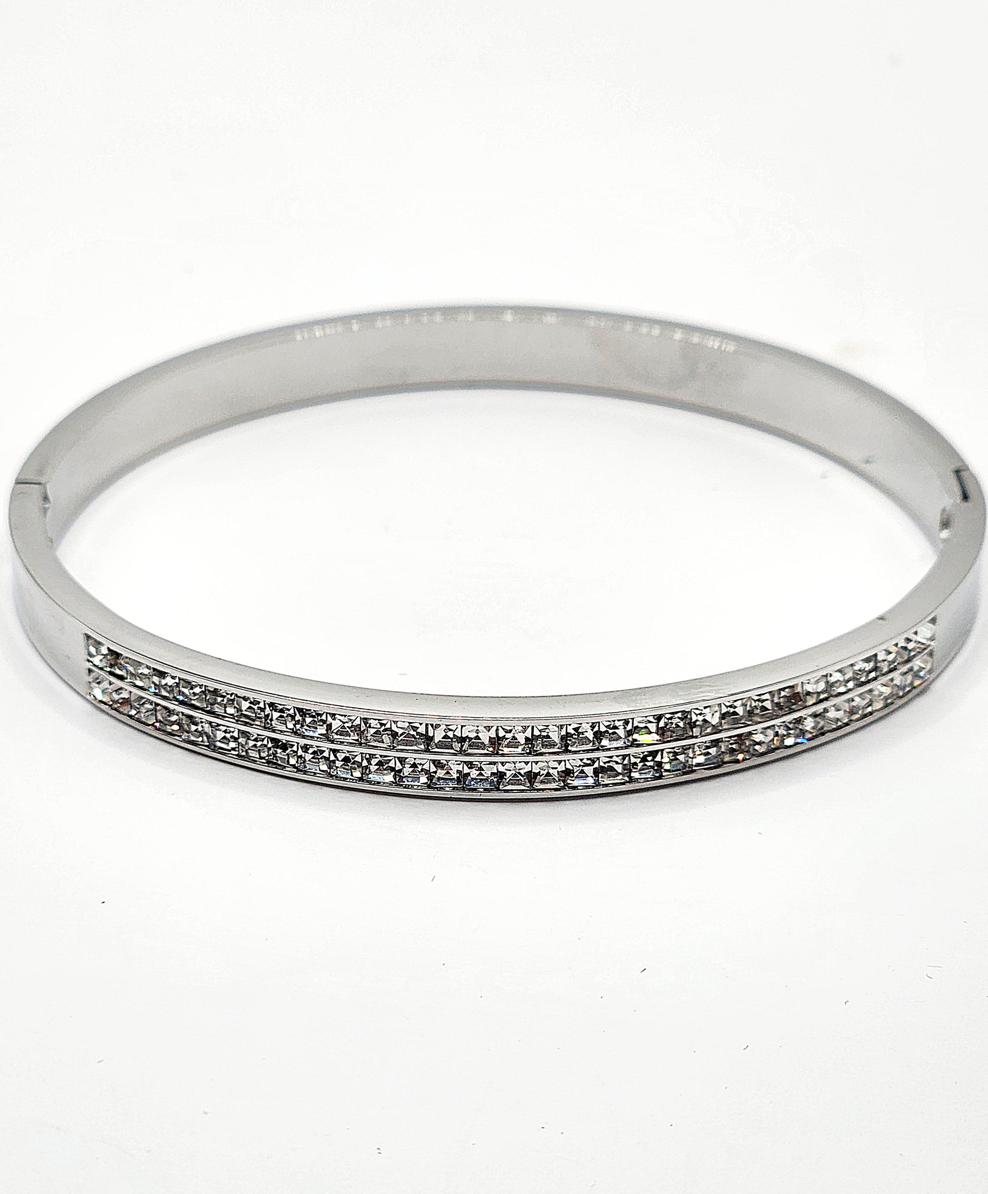 Adorn your wrist with the dazzling Crystal Pave Hinged Bracelet. Crafted from a durable stainless steel base, this bracelet features a brilliant band of shimmering crystals that catch every light.