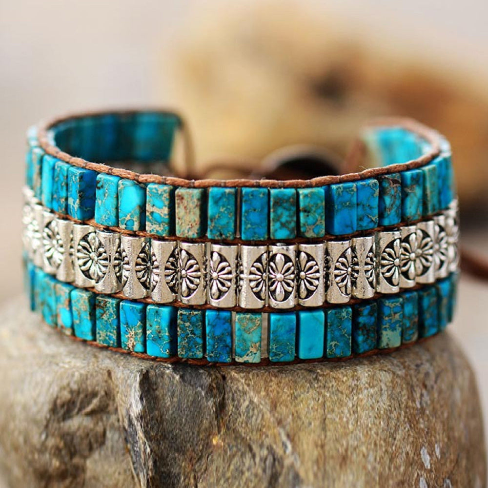 Display your bohemian spirit with our Handmade Triple Layer Natural Stone Bracelet! This stunning accessory radiates natural beauty and quirkiness, making it the perfect statement piece for any outfit. Each piece is carefully handcrafted with love, ensuring a one-of-a-kind addition to your collection. Don't be afraid to stand out with this playful and unique bracelet!