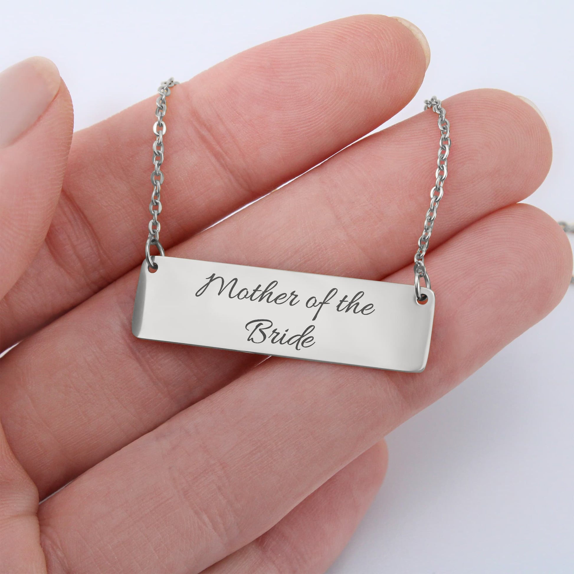 Celebrate the love, support, and strength that brought you to this day. Our Mother of the Bride bar necklace is a sophisticated and modern token of appreciation for the most important woman in your life. With a hand-polished mirror finish and refined script, this piece is designed to be a subtle yet powerful reminder of the beautiful bond you share.